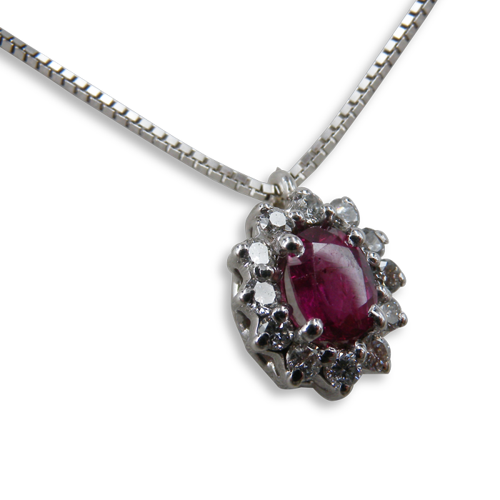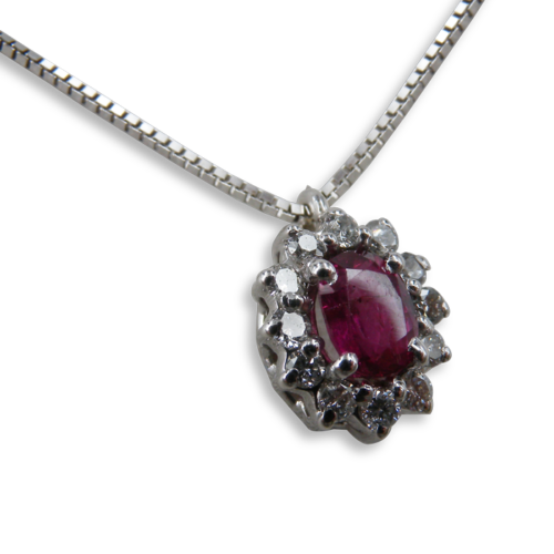 Eseguito a mano in oro bianco 18kt Ethical Gold Fairmined. Le pietre incastonate sono uno rubino ct.0,44 e brillanti tot.ct.0,19,riutilizzati.